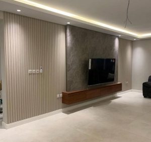 الجدران الجبسية أو الجصية: تقدم الجدران المصنوعة من الجبس أو الجص إمكانية إضافة لمسات فنية متنوعة حول الشاشات، مثل الزخارف الهندسية أو الأشكال الفنية التي تعزز جاذبية الشاشة.